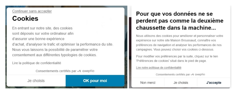 Le premier propose un bandeau de consentement des cookies standard, identique aux 50 autres bandeaux que votre prospect a vu aujourd’hui. Mention spéciale à l’usage du dark pattern qui planque l’option « Continuer sans accepter » de manière tout juste visible.